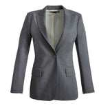 Grey wool single-breasted blazer with notch lapels, breast pocket and two flap pockets. Can be bought with the matching trousers. Looks fabulous as a trouser suit.